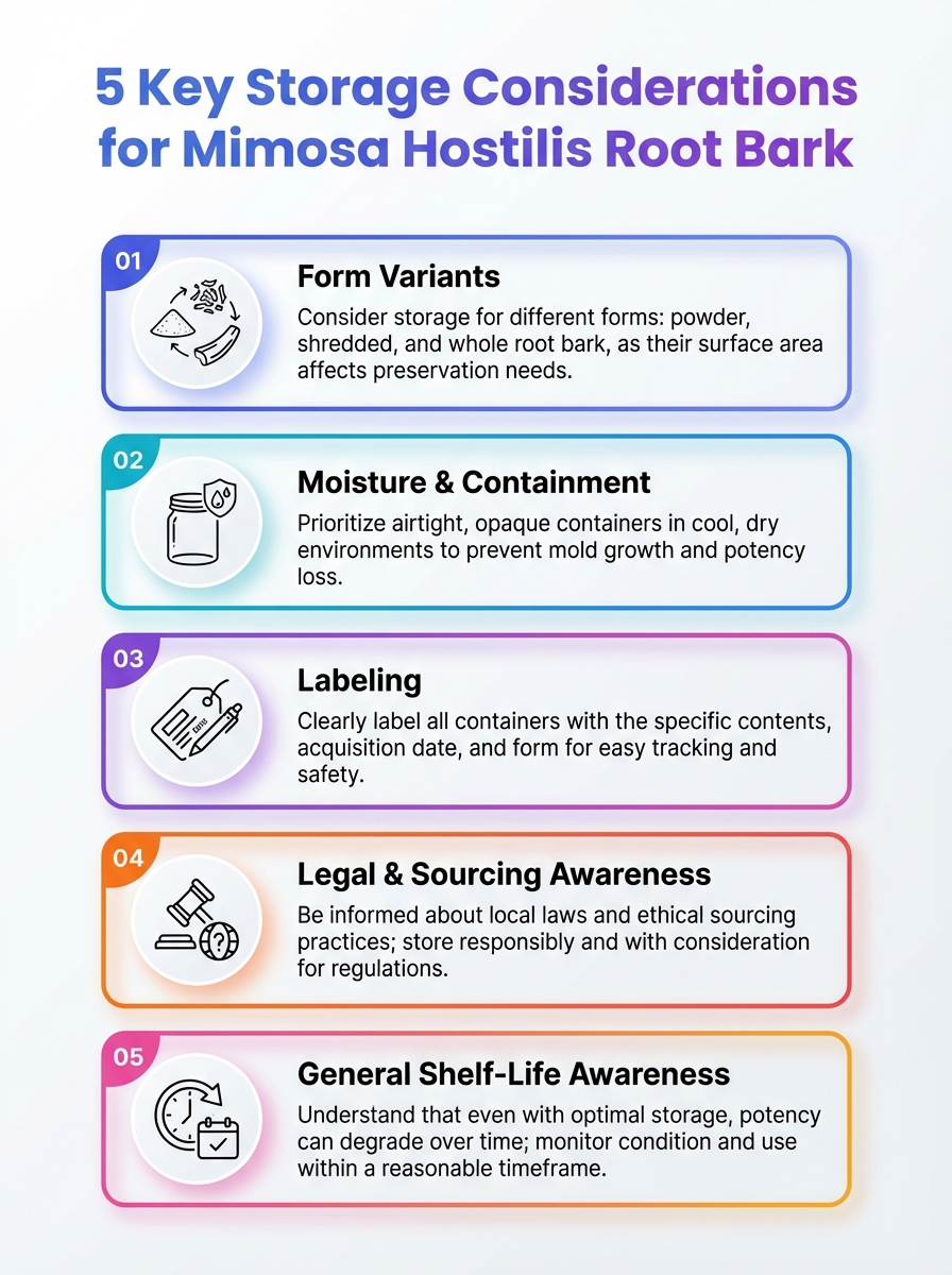 A concise visual guide showing five storage considerations for Mimosa Hostilis root bark to help readers keep it safe and effective.