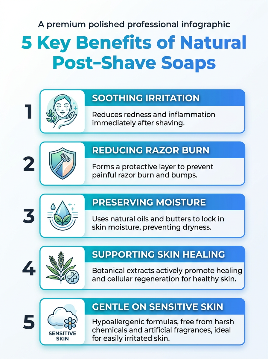 A quick visual guide to how natural post-shave soaps help prevent razor burn, highlighting 5 key benefits. Learn which ingredients make the difference.