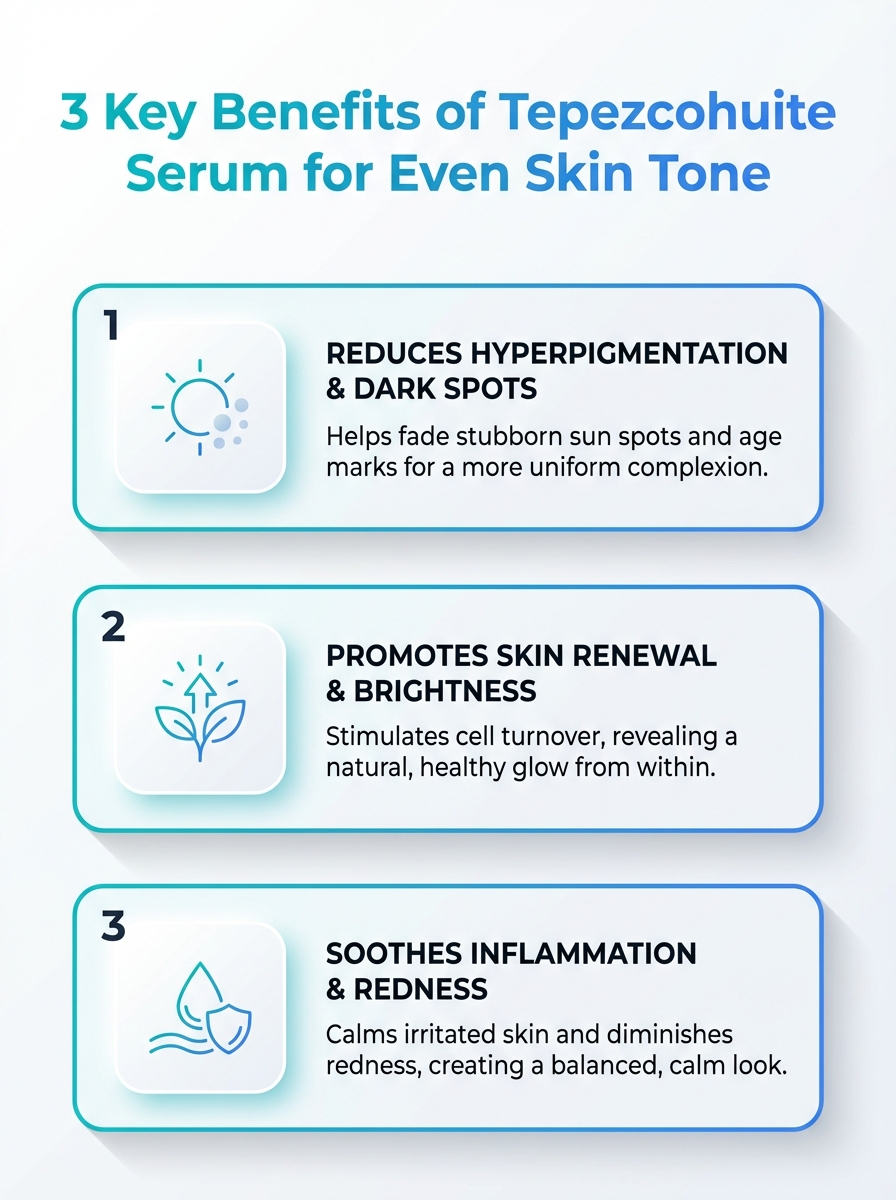Mimosa tepezcohuite is rich in natural compounds that help with the appearance of scars, spots, and signs of aging when used topically in skincare. For many users, this translates into a more even look over time, especially in areas that previously appeared blotchy or marked. It also contains antioxidants that help protect skin from environmental stressors that often contribute to uneven tone. By supporting hydration and comfort, it helps the skin surface stay smoother, which improves how evenly light reflects across the face. In sensitive or reactive skin, Mimosa tepezcohuite helps reduce the appearance of redness and irritation when formulated well. This gentler visual effect can be just as important as fading dark spots when you are pursuing a uniform complexion.Three key benefits of Tepezcohuite Serum for an even skin tone are highlighted. Learn how this serum can improve texture, brightness, and overall evenness.