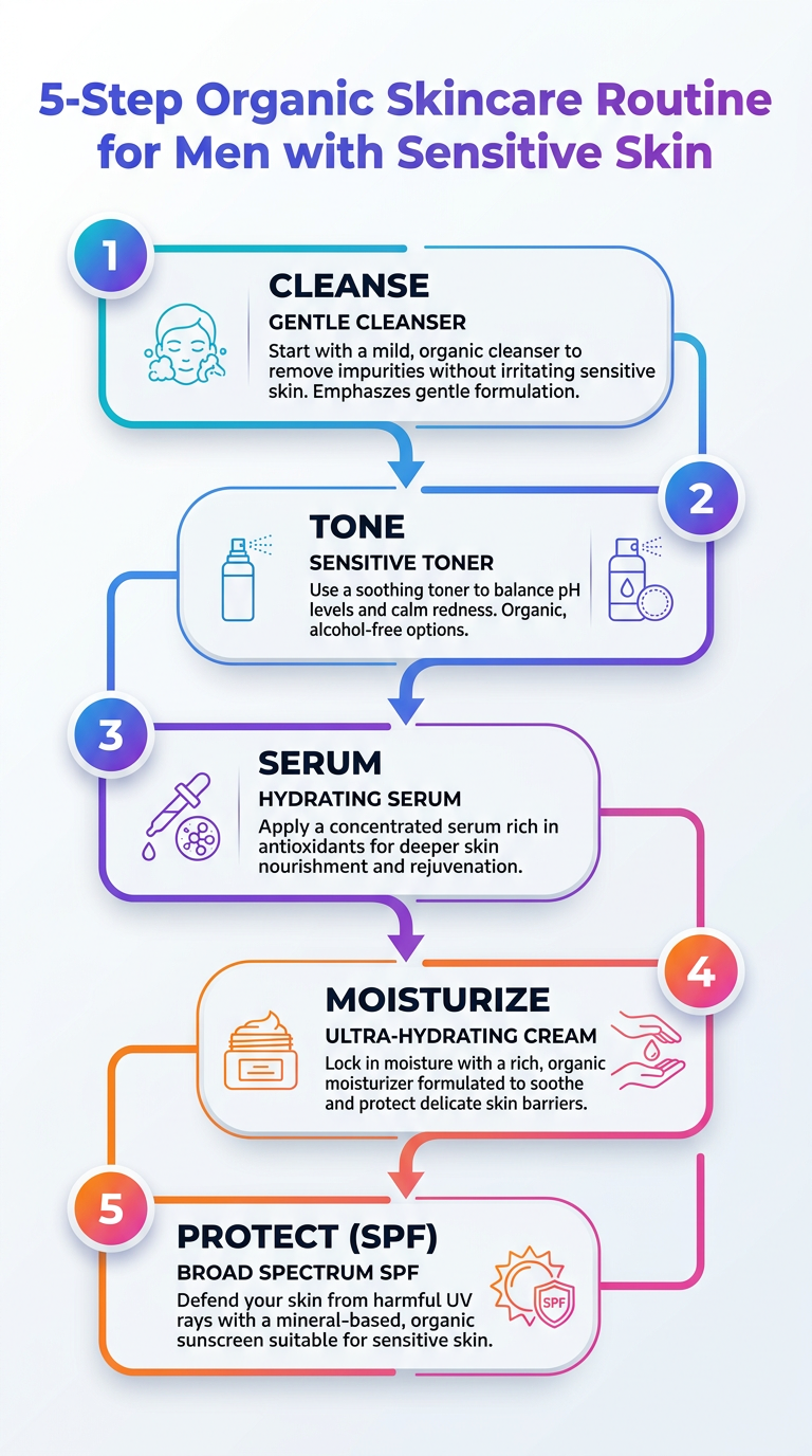 The first step in any organic routine is a cleanser that removes dirt without stripping away essential oils. Our Mayan Magic Gentle Cleanser is specifically designed for men with easily provoked skin. For those who prefer a solid format, our face soaps offer a traditional feel with modern, skin-safe ingredients. These bars utilize kaolin clay and charcoal to purify the skin while maintaining a gentle touch. We recommend washing with lukewarm water to avoid thermal stress on your skin. A gentle cleanse twice daily keeps the pores clear and the surface ready for subsequent treatments.This infographic breaks down a gentle 5-step organic skincare routine for men with sensitive skin. It highlights safe products and simple steps you can follow daily.