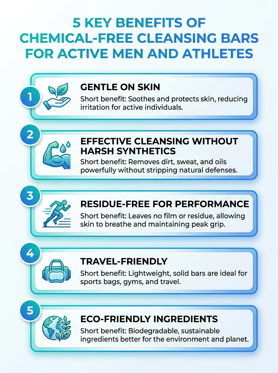 Explore how chemical-free cleansing bars support active lifestyles. This infographic highlights 5 key benefits for active men and athletes.