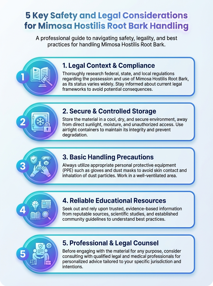 This infographic highlights five key safety and legal considerations for Mimosa Hostilis Root Bark handling. It helps readers stay informed and compliant.